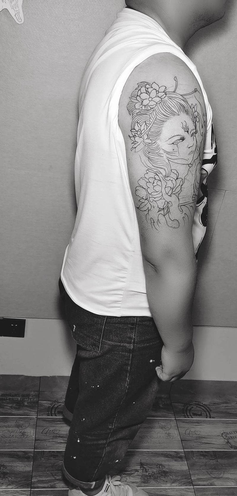 当前位置: 首页 >云南省曲靖市纹身店-金艺神刺工作室纹身图案>艺妓 线条纹身图片_手臂纹身图案