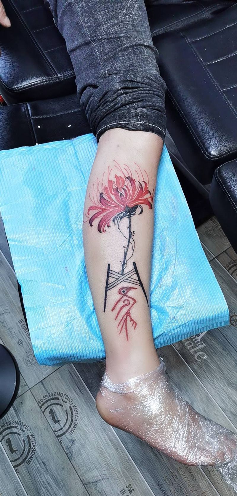 当前位置: 首页 >云南省曲靖市纹身店-金艺神刺工作室纹身图案>彼岸花纹身图片_腿部纹身图案