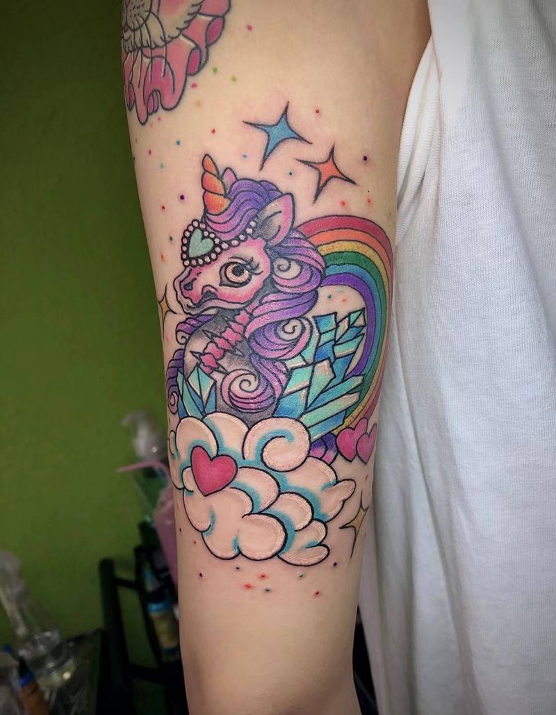 当前位置: 首页 >四川省成都市纹身店-520tattoo瞳稚刺青纹身图案>独角兽彩虹纹身图片_手臂New School独角兽纹身图案