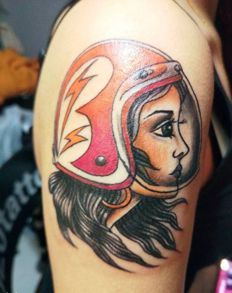 机车女神纹身图片_肩部手臂欧美肖像人物原创old 成品手稿纹身图案