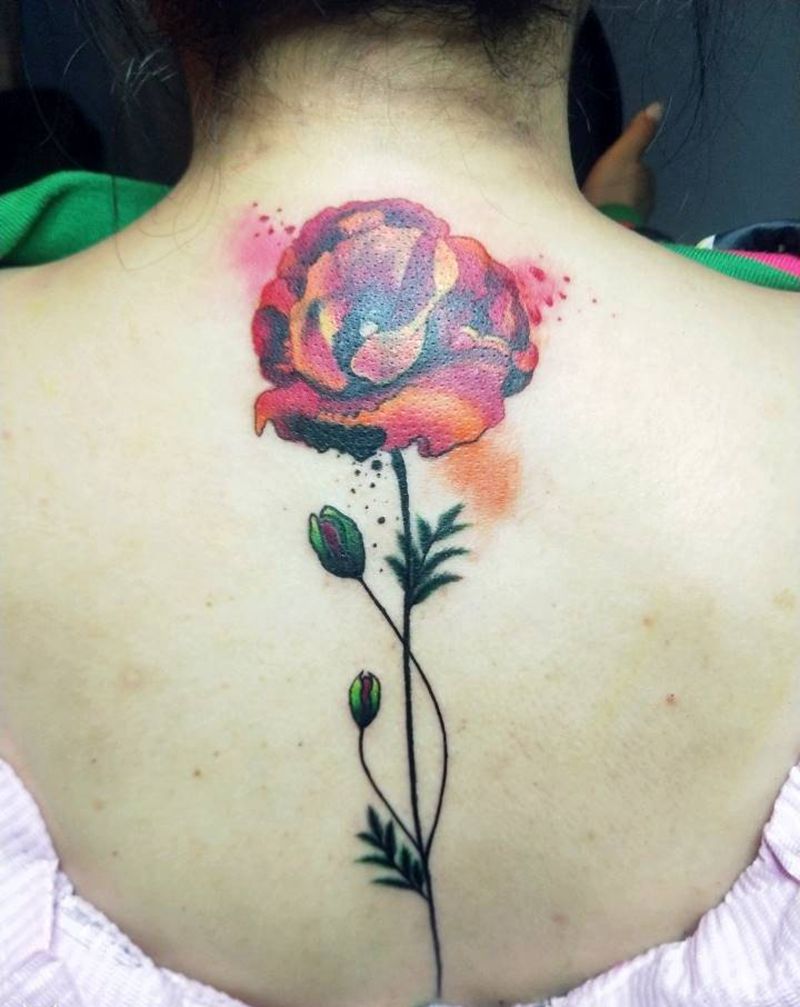 罂粟纹身图片_颈部背部清新植物遮盖水彩成品纹身图案