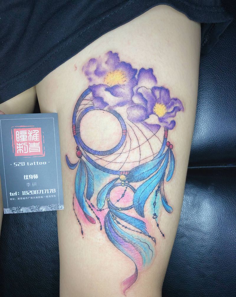 捕梦网烫伤遮盖纹身图片_腿部水彩捕梦网纹身图案