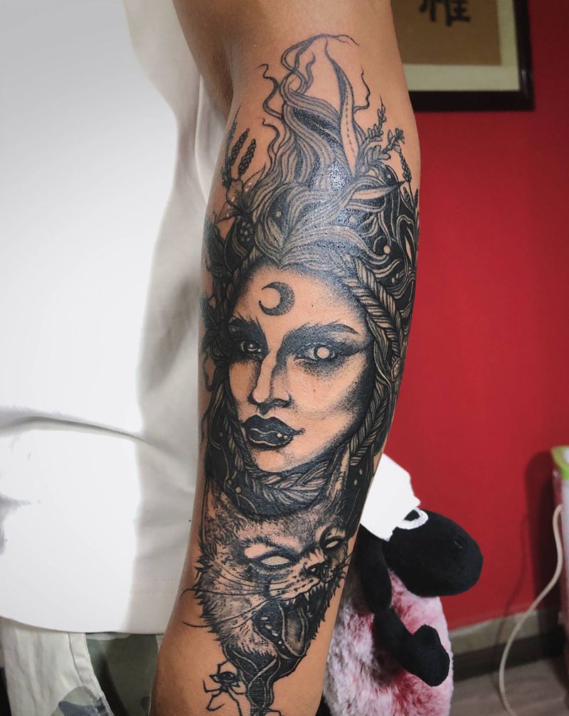 暗黑女神纹身图片_手臂点刺暗黑肖像纹身图案