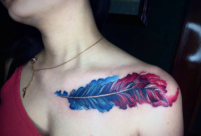 羽毛遮盖纹身图片_胸部水彩羽毛纹身图案
