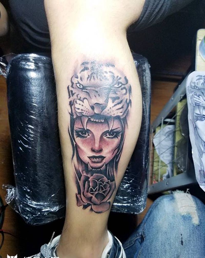 • T网红王老大花腿龙纹身图片_腿部新传统纹身图案