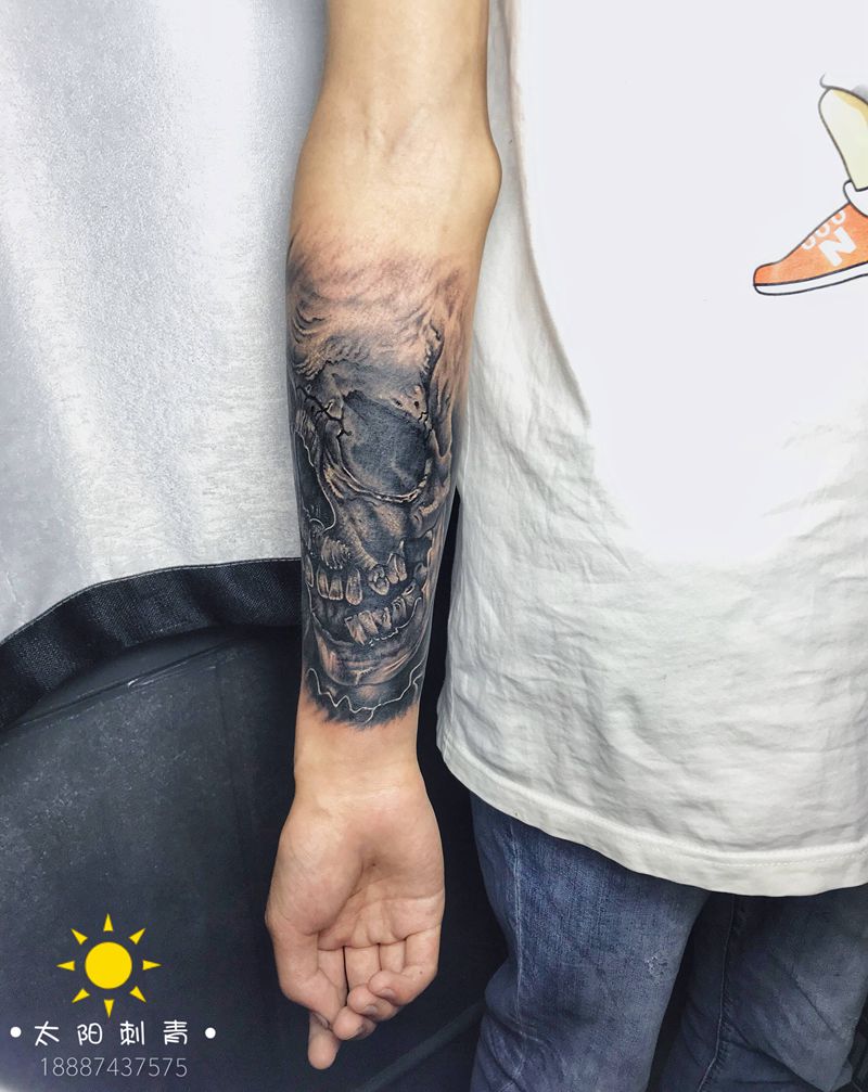 当前位置: 首页 >云南省曲靖市纹身店-曲靖太阳刺青纹身图案>写实骷髅纹身图片_手臂欧美写实纹身图案
