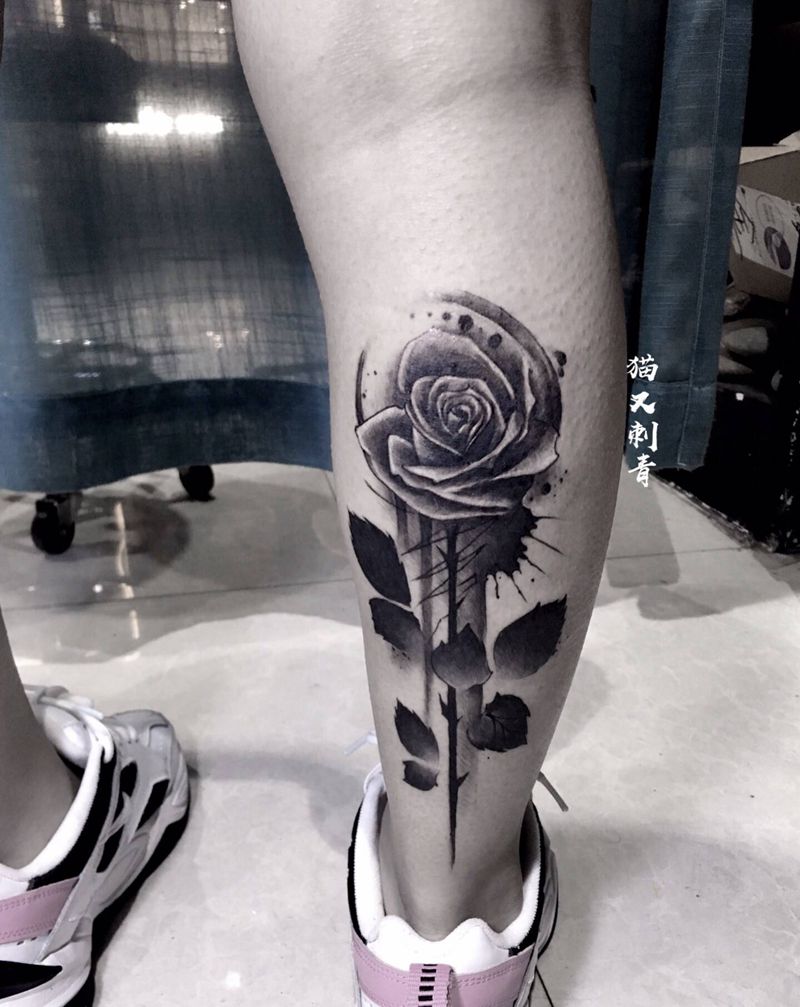 玫瑰纹身图片_腿部纹身图案