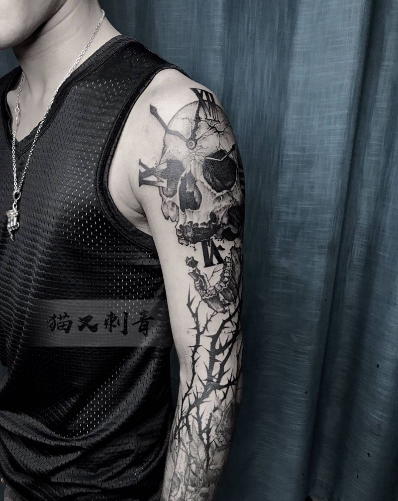 荆棘骷髅纹身图片_手臂点刺纹身图案