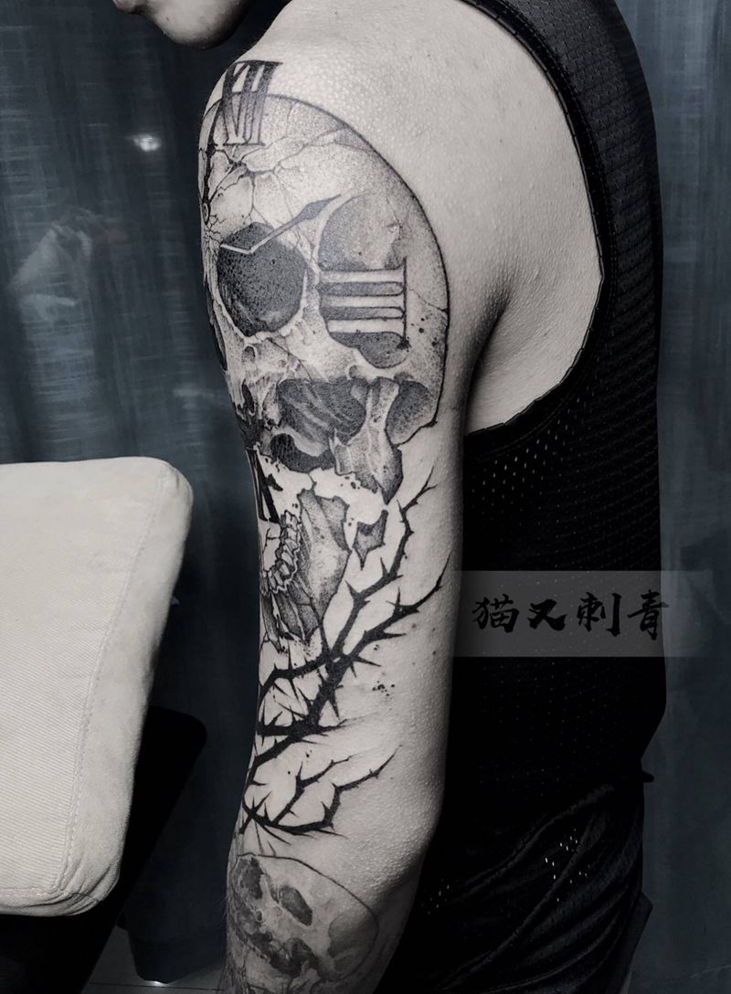 荆棘骷髅纹身图片_手臂点刺纹身图案