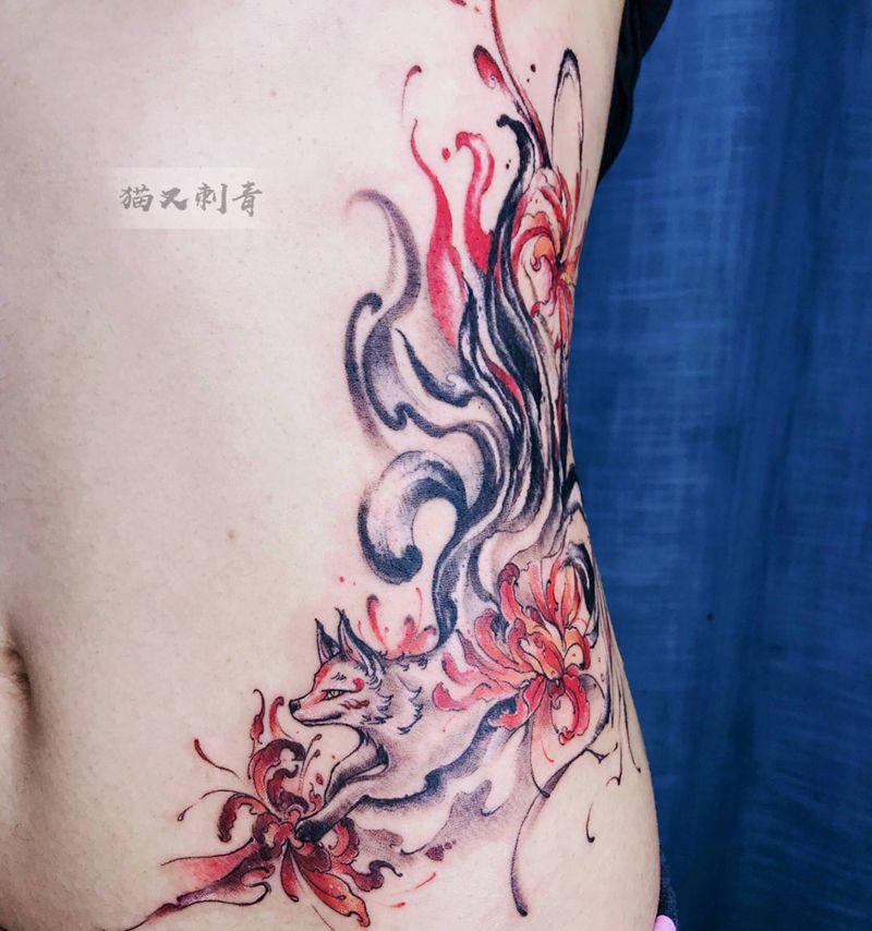 九尾纹身图片_腰部水墨纹身图案