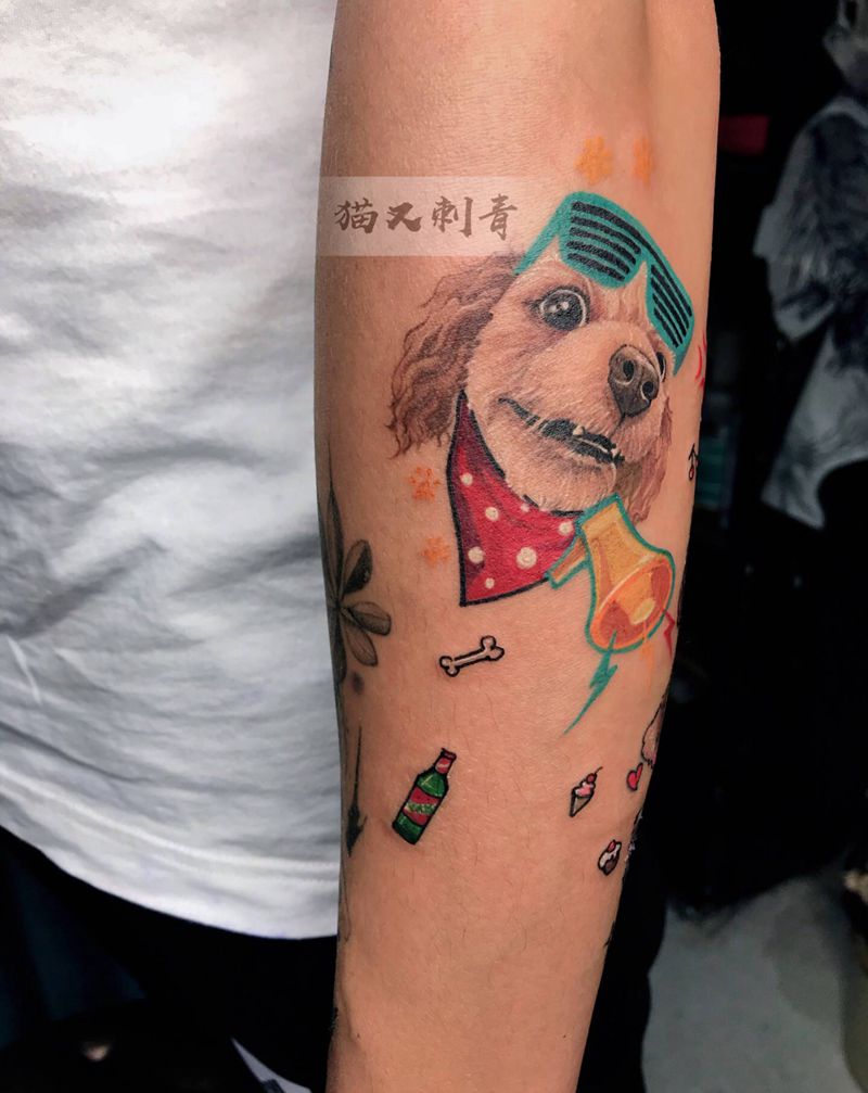 当前位置: 首页 >云南省昆明市纹身店-猫又刺青纹身图案>原创设计客人家的狗子纹身图片_手臂New School欧美写实纹身图案