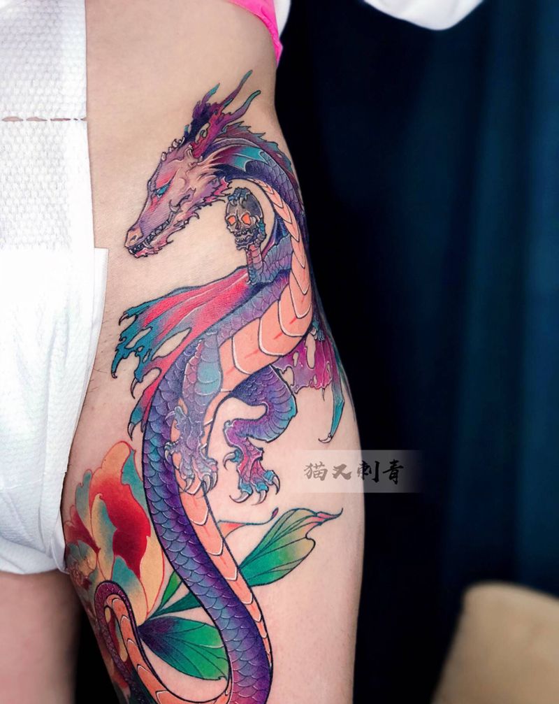• T网红王老大花腿龙纹身图片_腿部新传统纹身图案