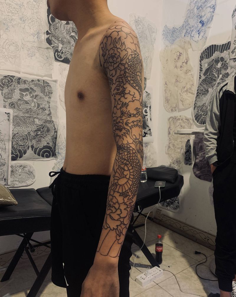 • T网红王老大花腿龙纹身图片_腿部新传统纹身图案