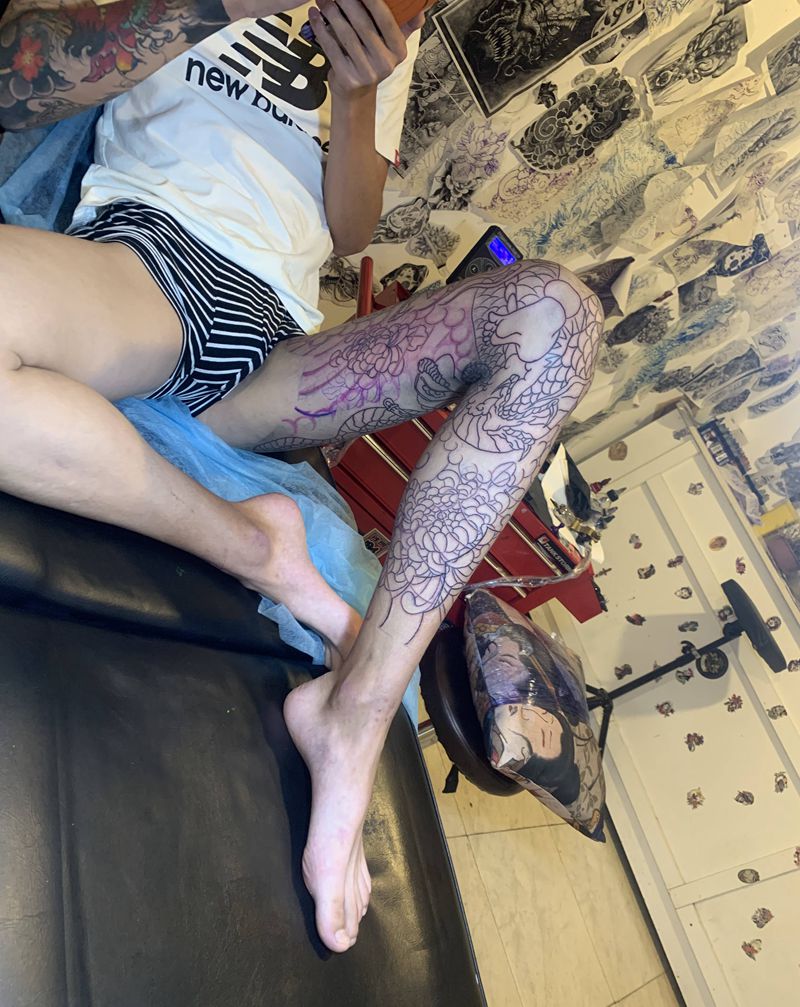 • T网红王老大花腿龙纹身图片_腿部新传统纹身图案