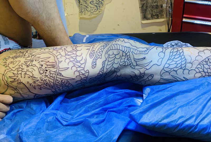 • T网红王老大花腿龙纹身图片_腿部新传统纹身图案