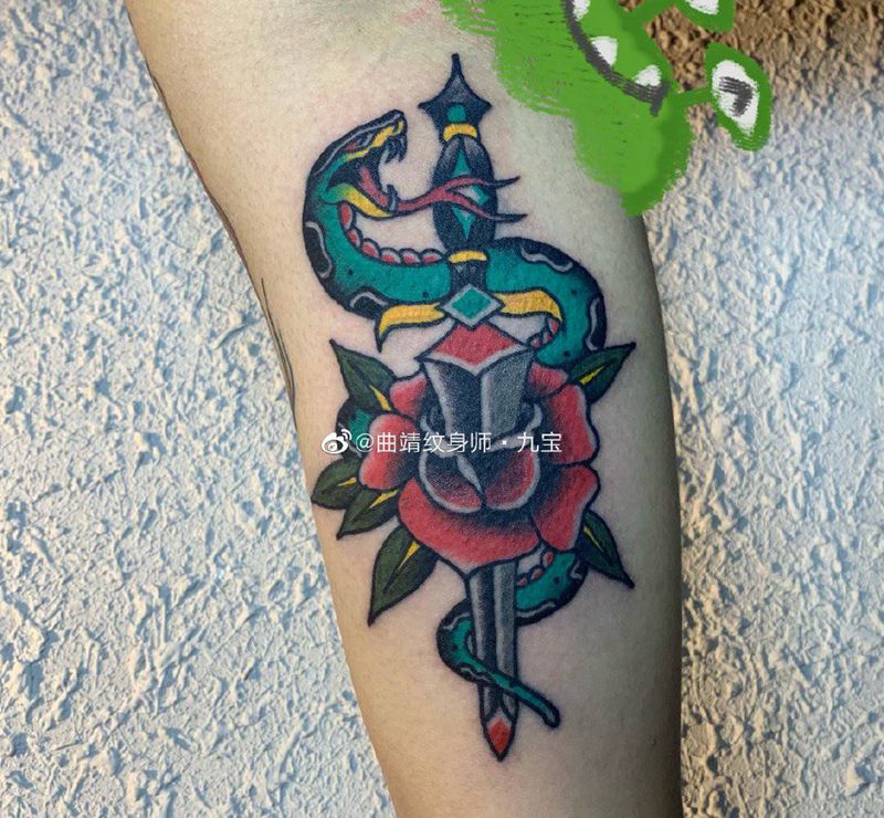 当前位置: 首页 >云南省曲靖市纹身店-太阳刺青纹身图案>old school匕首纹身图片_手臂手部Old School玫瑰蛇匕首纹身图案