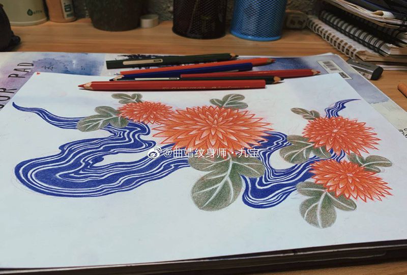 当前位置: 首页 >云南省曲靖市纹身店-太阳刺青纹身图案>菊与水纹身图片_肩部背部老传统水墨菊花水流纹身图案