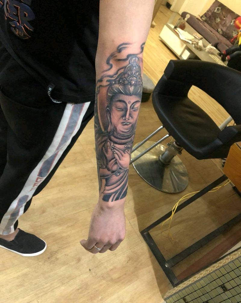 菩萨包小臂纹身图片_手臂传统人物成品纹身图案