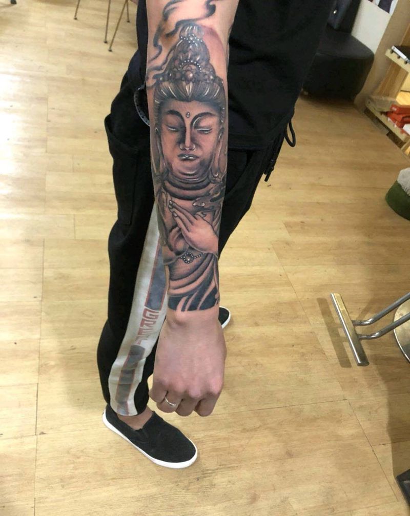 菩萨包小臂纹身图片_手臂传统人物成品纹身图案