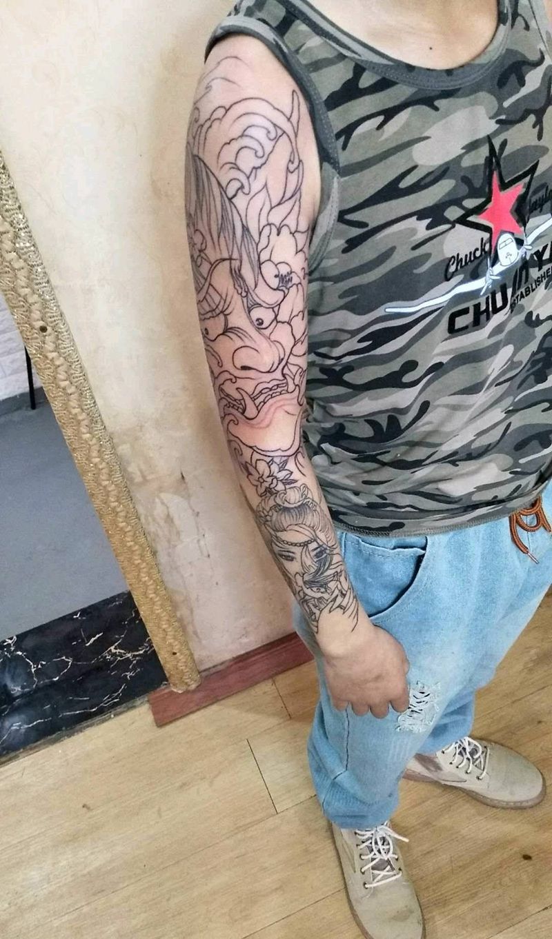 当前位置: 首页 >云南省曲靖市纹身店-AK纹身纹身图案>花臂线条纹身图片_手臂传统人物鬼神成品纹身图案
