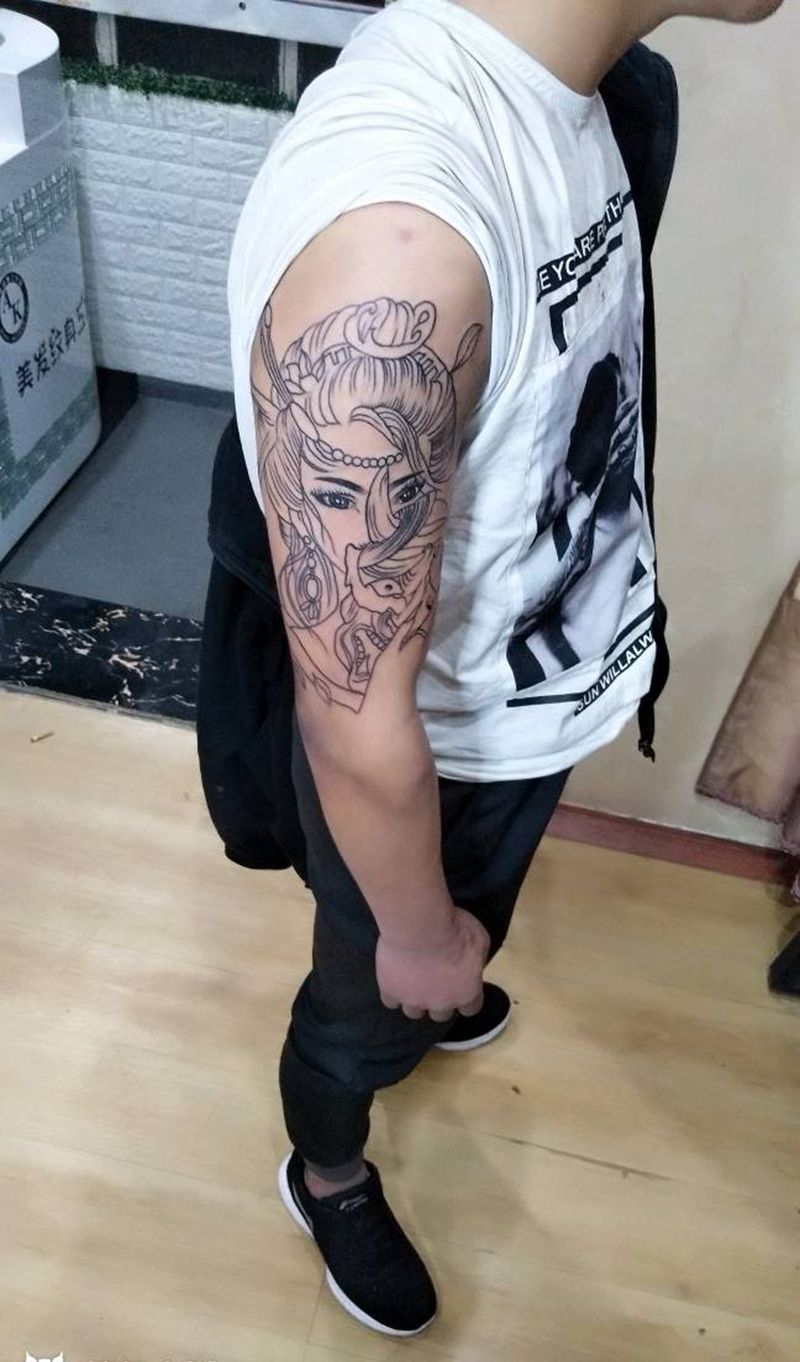 艺妓线条未完成纹身图片_手臂传统人物成品纹身图案