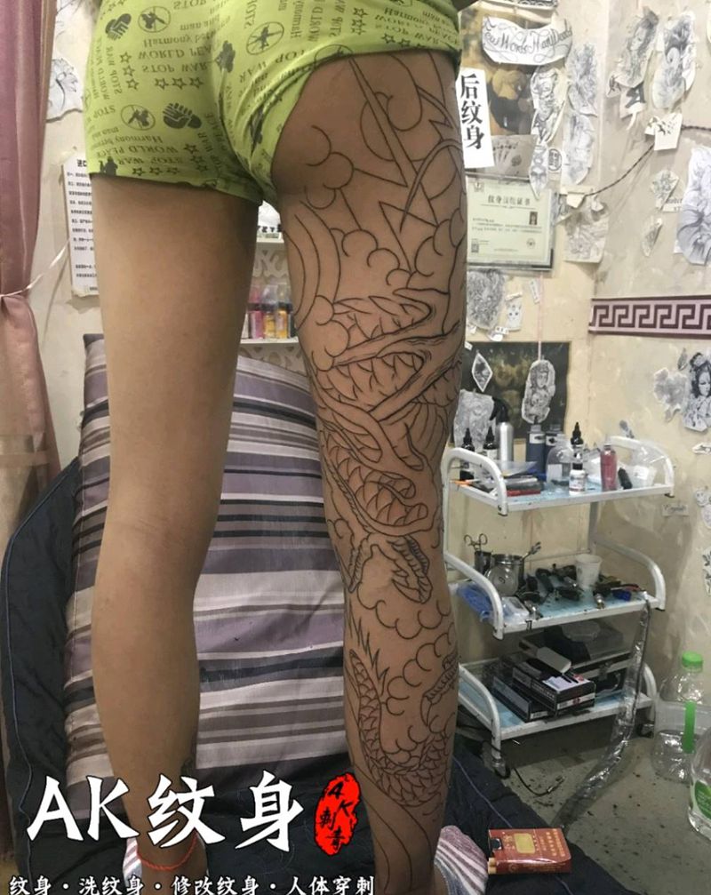 • T网红王老大花腿龙纹身图片_腿部新传统纹身图案