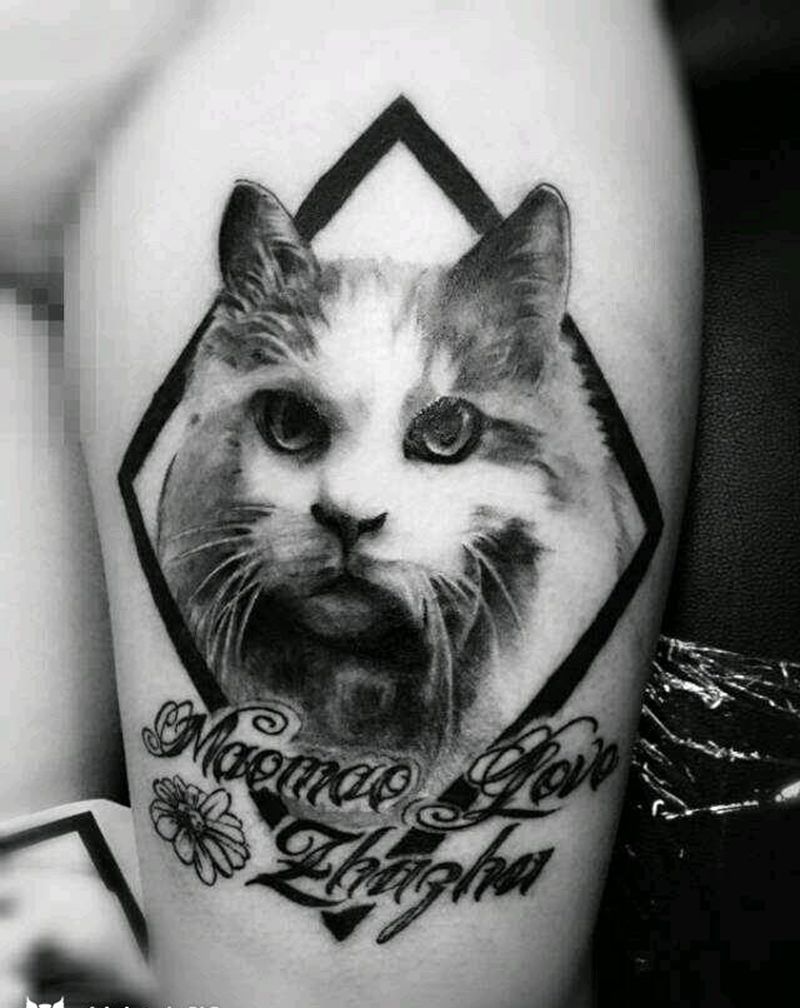 写实猫纹身图片_腿部肖像写实几何动物原创纹身图案