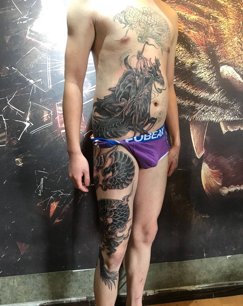 • T网红王老大花腿龙纹身图片_腿部新传统纹身图案