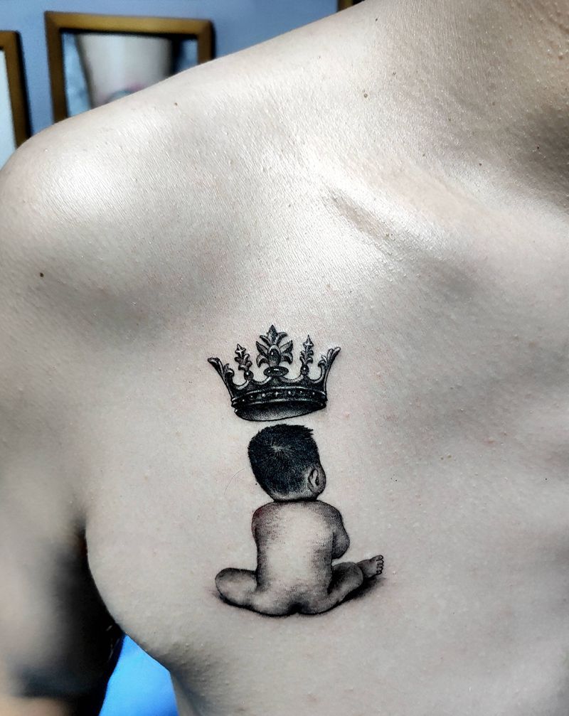 可爱的父亲纹身图片_胸部颈部欧美写实水墨纹身图案
