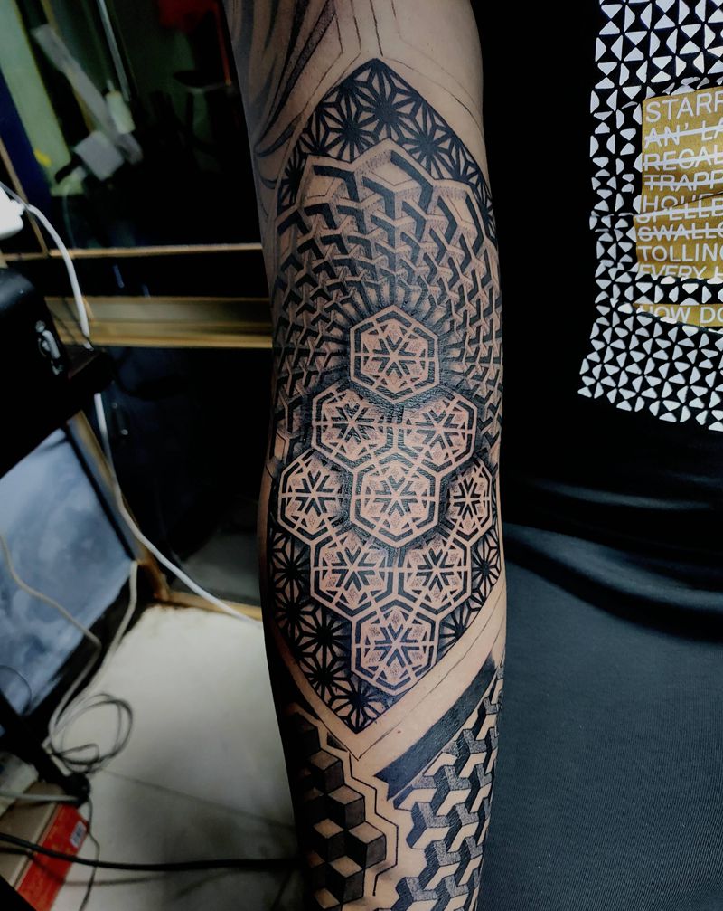当前位置: 首页 >云南省楚雄彝族自治州纹身店-江一刺青纹身图案>几何花臂未完成纹身图片_手部手臂图腾几何几何点刺图腾花臂纹身图案