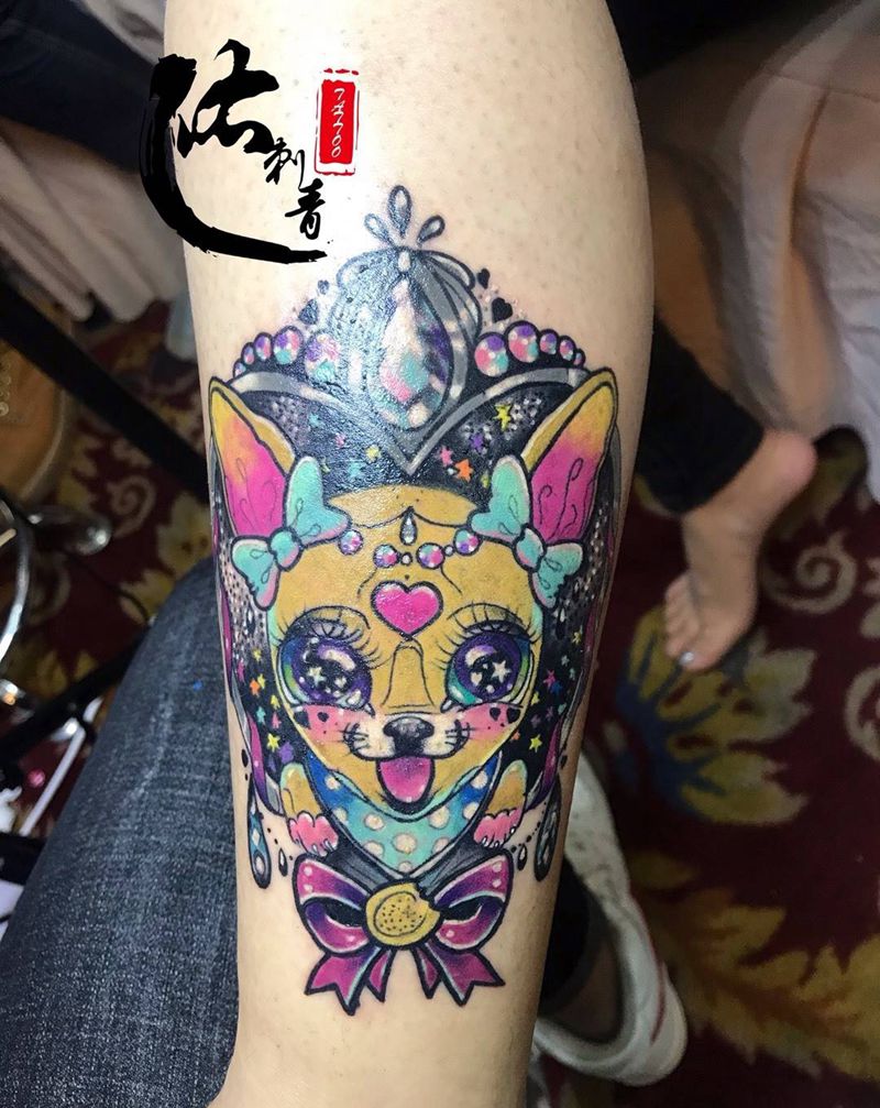 当前位置: 首页 >云南省红河哈尼族彝族自治州纹身店-左右刺青工作室纹身图案>本命狗纹身图片_腿部New School纹身图案