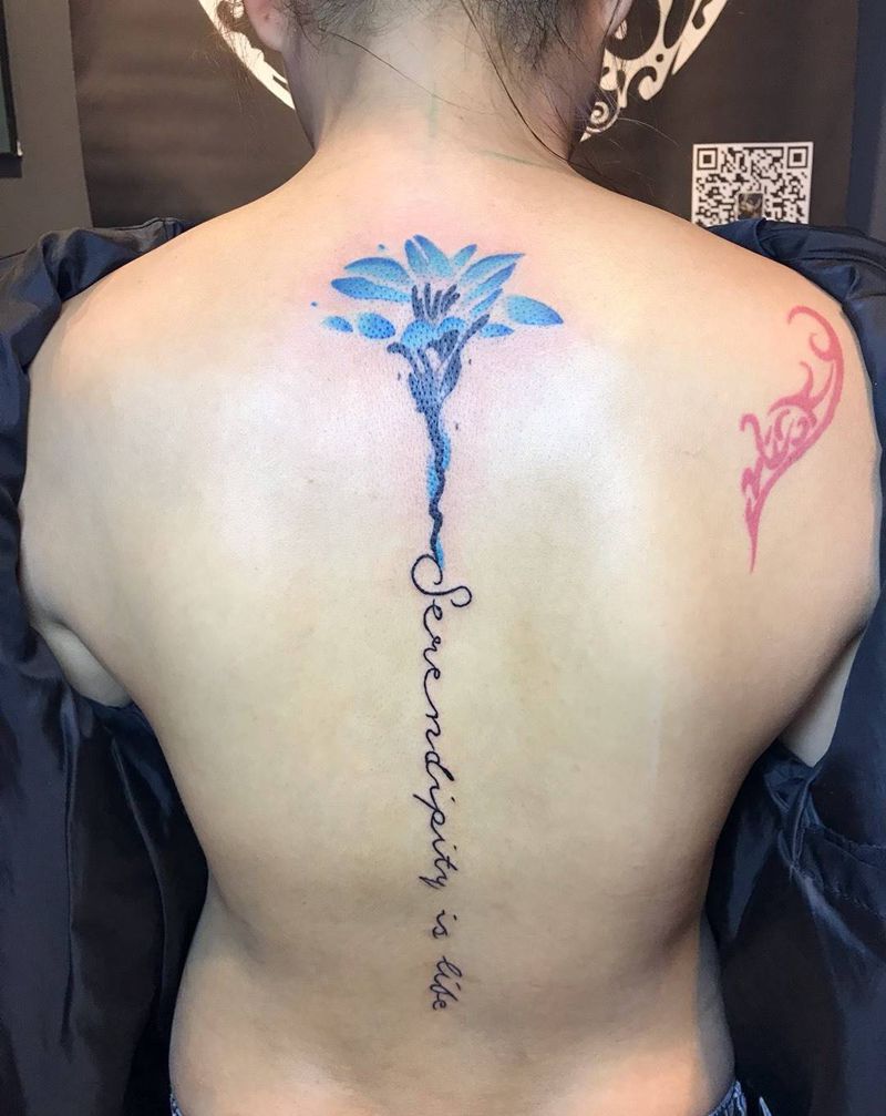 背脊水墨加英文纹身图片_背部水墨水彩纹身图案