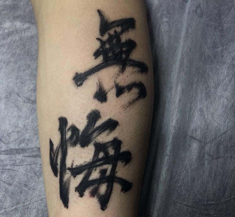 当前位置: 首页 >云南省大理白族自治州纹身店-叁肆纹身工作室纹身图案>无悔纹身图片_腿部水墨纹身图案