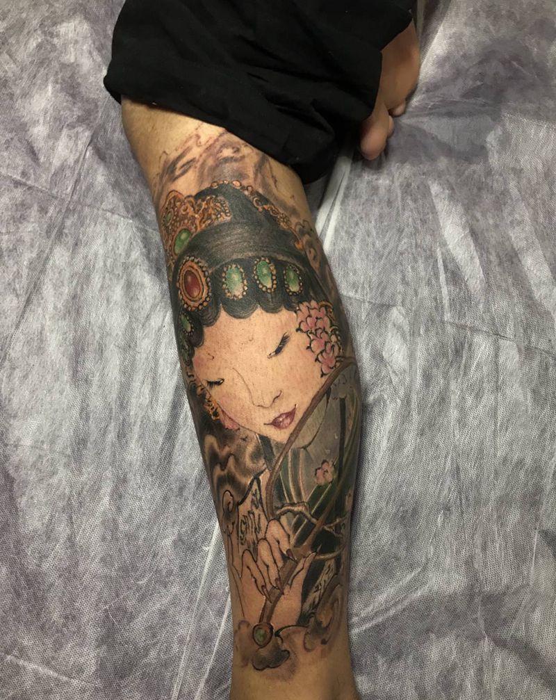 当前位置: 首页 >云南省大理白族自治州纹身店-叁肆纹身工作室纹身图案>花旦纹身图片_腿部新传统老传统纹身图案