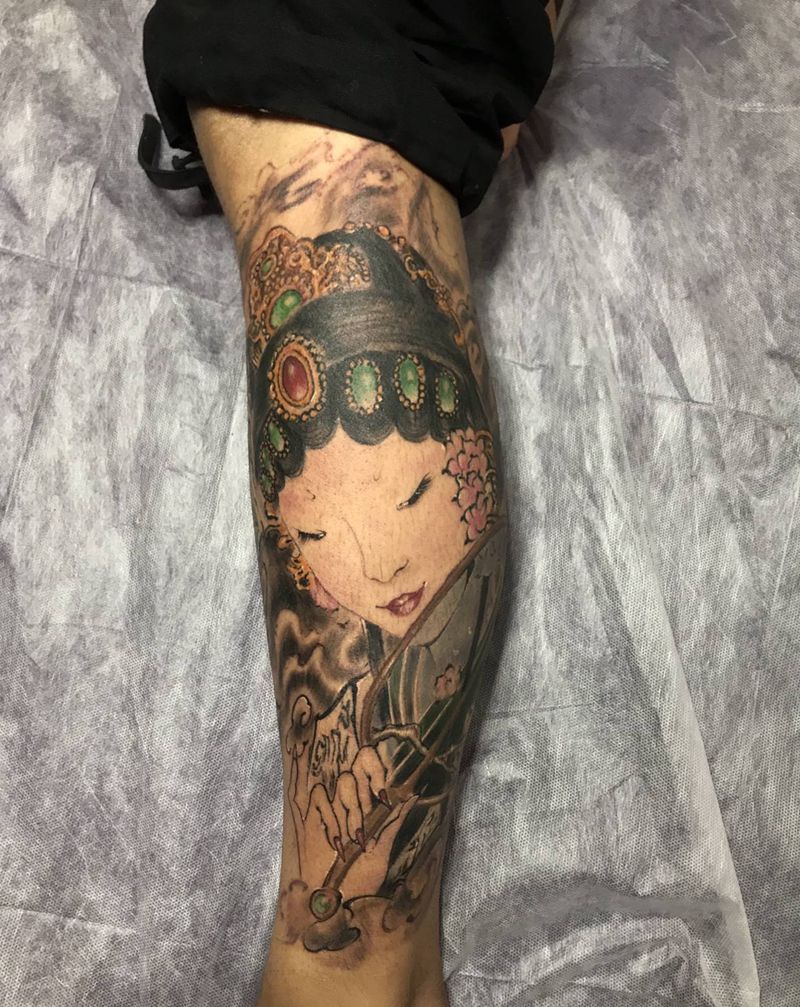 当前位置: 首页 >云南省大理白族自治州纹身店-叁肆纹身工作室纹身图案>花旦纹身图片_腿部新传统老传统纹身图案
