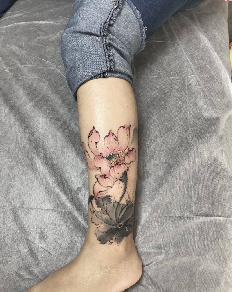 莲花(遮盖)纹身图片_腿部水墨纹身图案