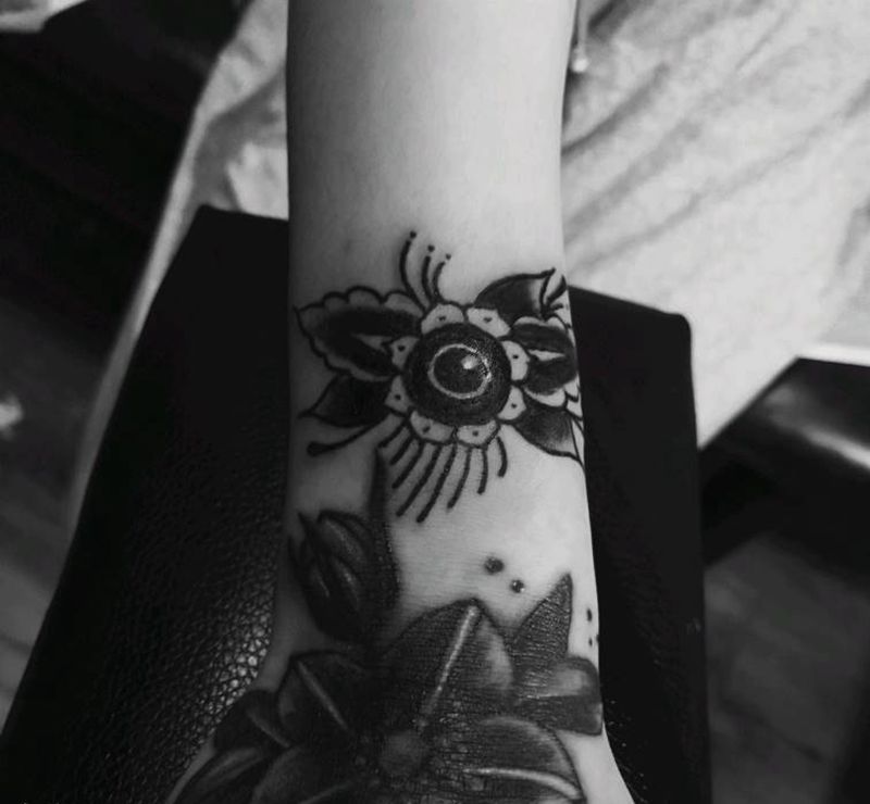 • 手背潮流时尚的玫瑰花眼睛纹身图案