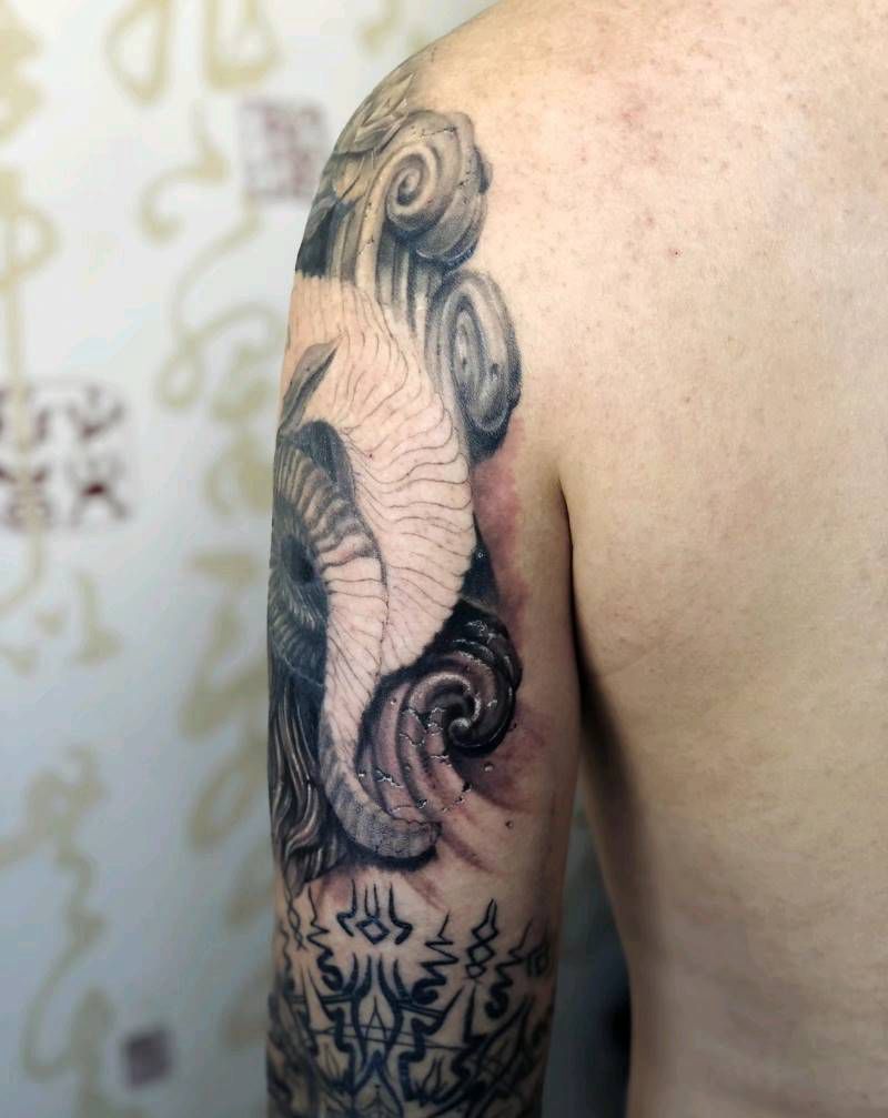 当前位置: 首页 >云南省大理白族自治州纹身店-叁肆纹身工作室纹身图案>羊头(川哥作品,未完成)纹身图片