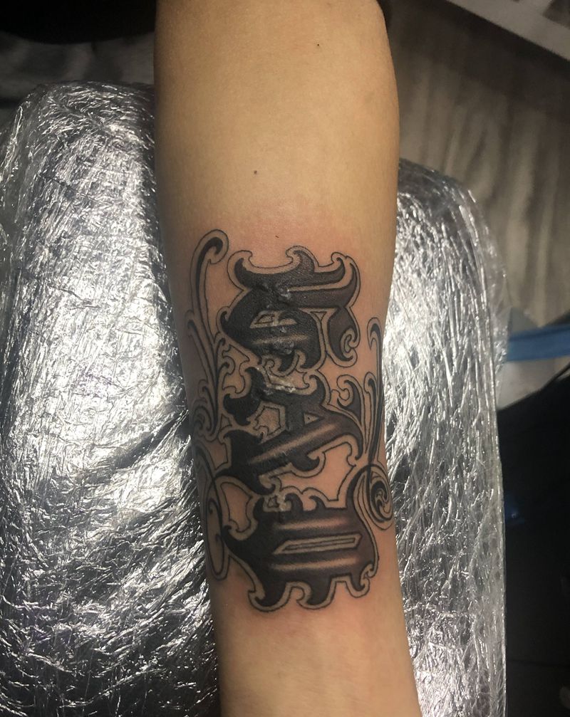 当前位置: 首页 >西藏日喀则地区纹身店-涅墨刺青纹身图案>疤痕遮盖纹身图片_手臂花体字遮盖纹身图案