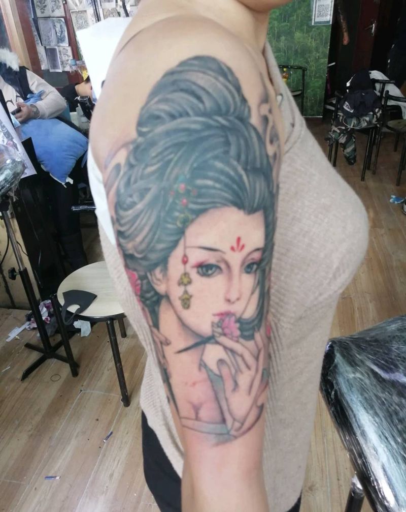 上次上臂艺妓纹身图片_手臂新传统艺妓纹身图案