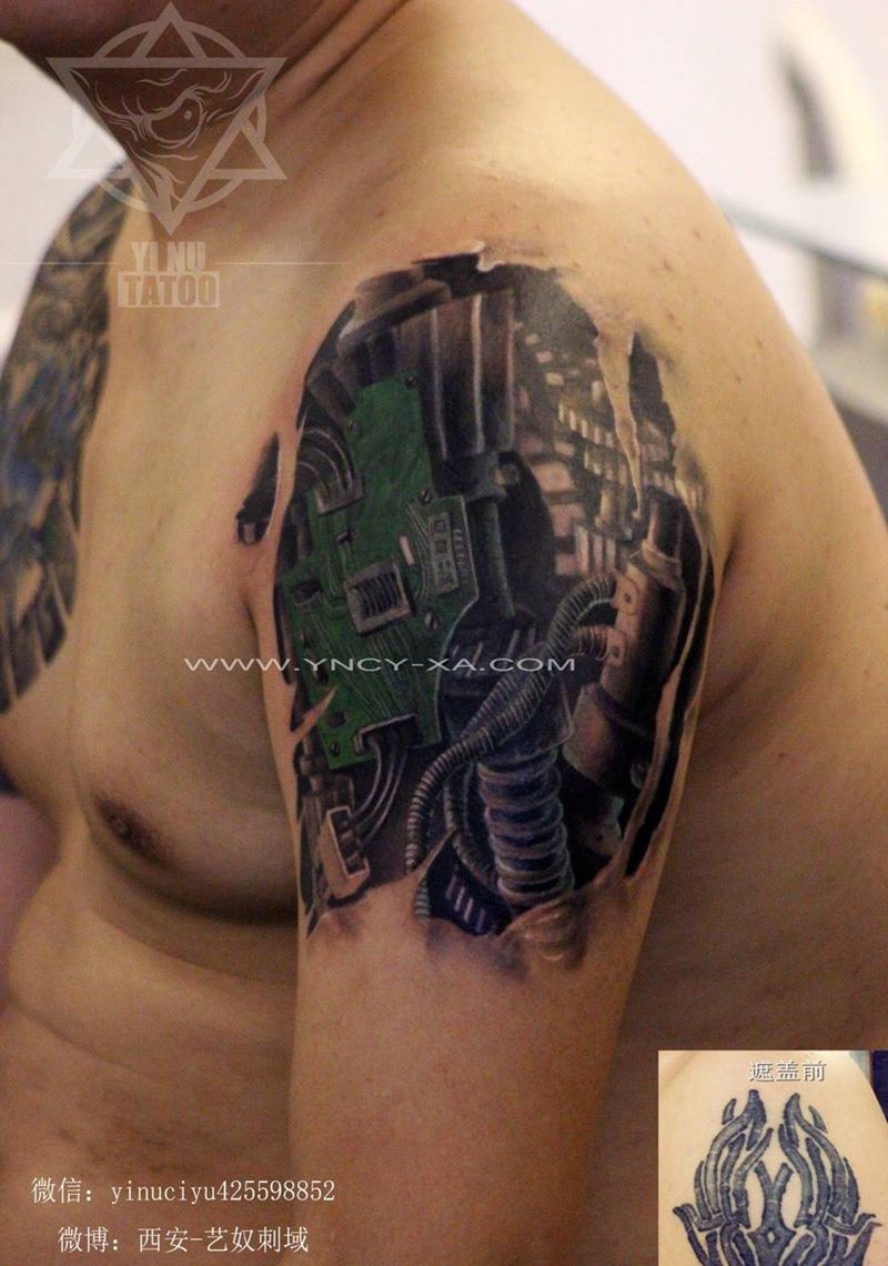 和尚老师原创机械遮盖纹身图片_成品手臂写实原创艺奴刺域纹身图案