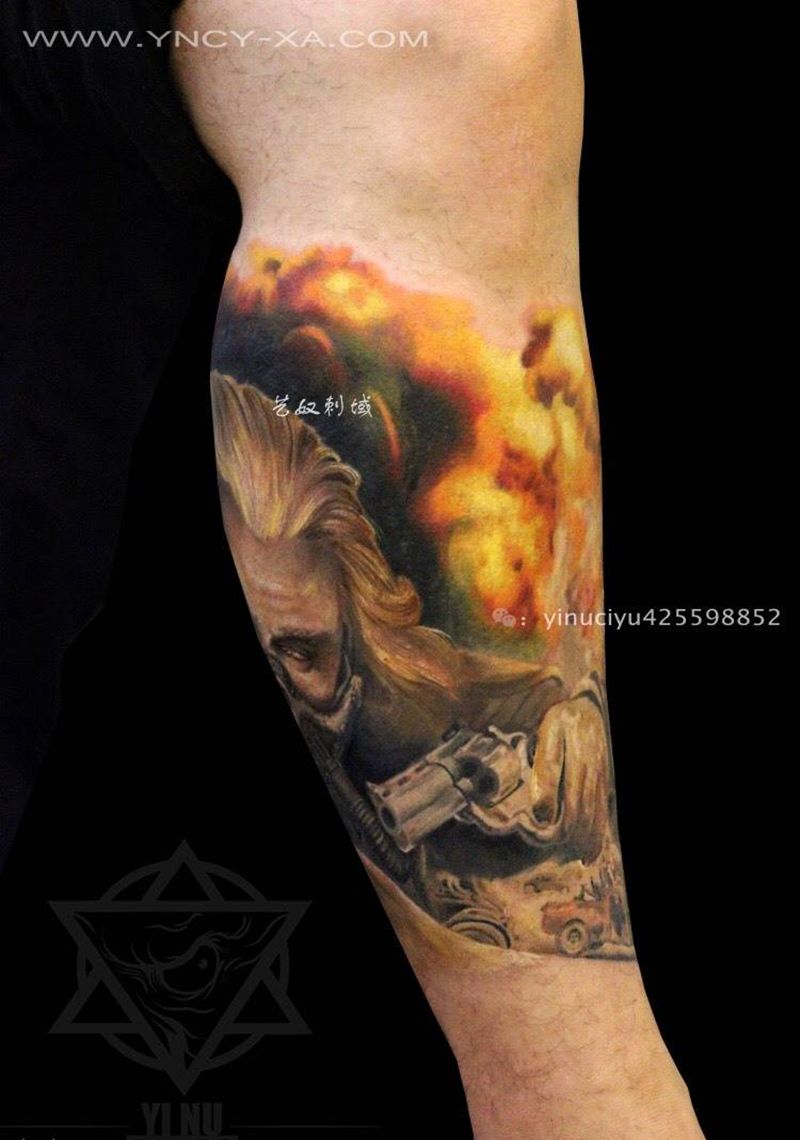 和尚老师作品:疯狂麦克斯纹身图片_成品腿部欧美肖像写实人物艺奴刺域纹身图案