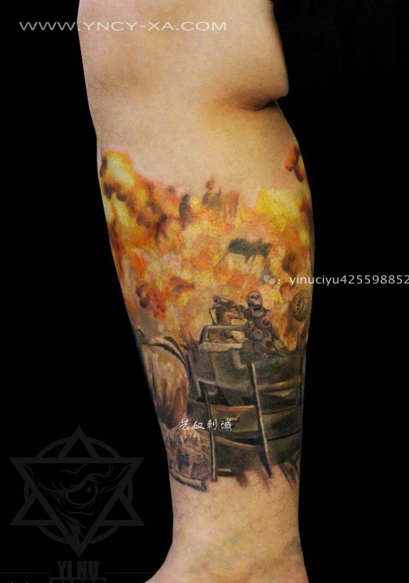 和尚老师作品:疯狂麦克斯纹身图片_成品腿部欧美肖像写实人物艺奴刺域纹身图案