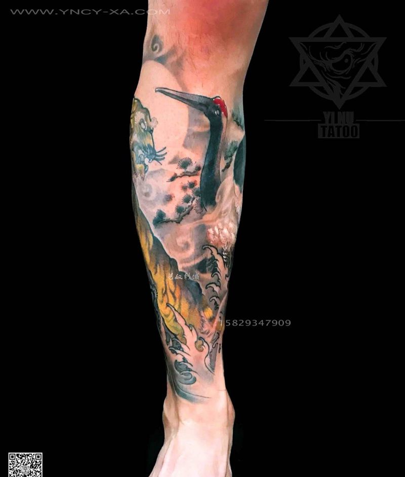 和尚老师原创 虎鹤小腿纹身图片_艺奴刺域原创腿部传统成品动物纹身图案