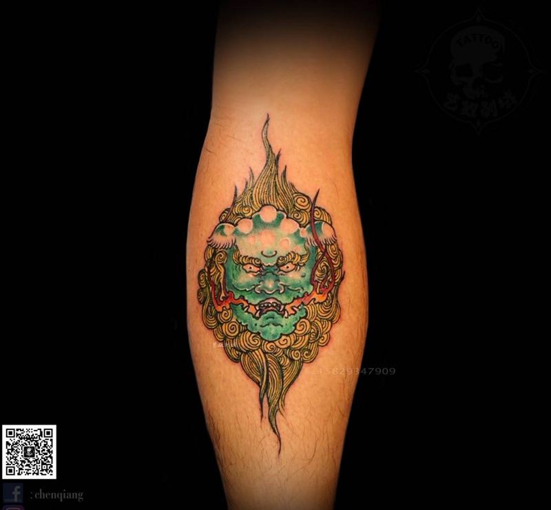 和尚老师原创-瑞兽唐狮纹身图片_腿部新传统艺奴刺域原创纹身图案