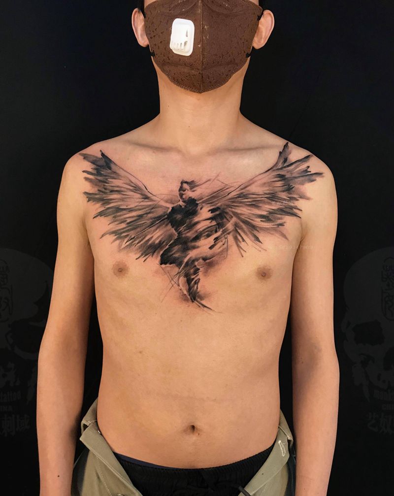 花胸纹身图片_胸部水墨中国风翅膀纹身图案
