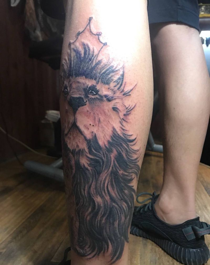 狮子纹身图片_成品腿部欧美写实动物西安纹身图案