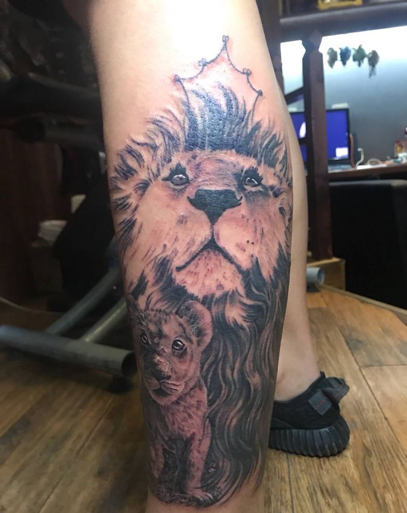 狮子纹身图片_成品腿部欧美写实动物西安纹身图案