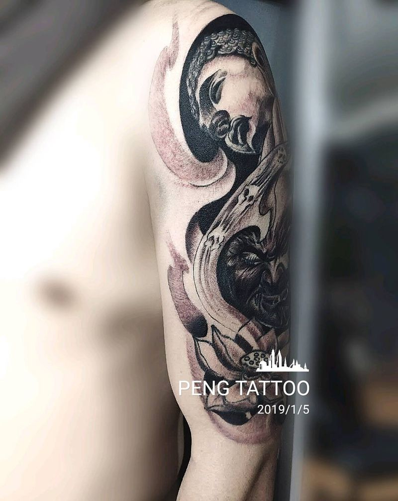 当前位置: 首页 >陕西省西安市纹身店-TATTOO HONE纹身工作室纹身图案>佛与魔纹身图片
