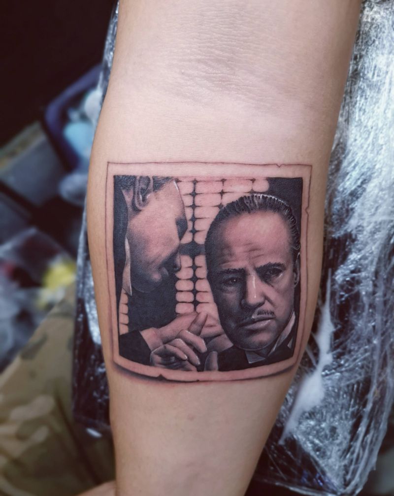 当前位置: 首页 >陕西省西安市纹身店-留白刺青纹身图案>教父纹身图片_手臂欧美写实纹身图案